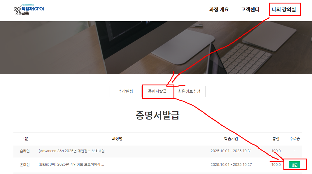 교육 접수 시 안내 드렸던 개인정보배움터(edu.privacy.go.kr)를 통한 수료증 발급이